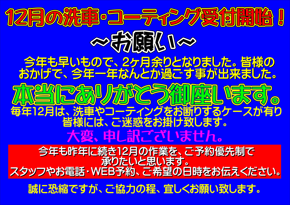 - 12月の洗車・コーティングはご予約制で承ります。ご予約はお早めに!