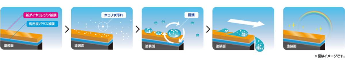ダイヤⅡキーパーは、特殊なコーティング表面の分子構造の効果で、ファンデルワールス力(分子間力)による"汚れ"の密着を防ぐ独特な防汚能力を持ち、ホコリが降り積もっても、塗装表面には密着せず、自然の雨が降れば、元々持っている撥水力で弾かれた水と一緒に、ホコリなどの汚れが落ち、まるで洗車をしたかのようにキレイになります。※雨自体が黄砂等を含んでいる場合は汚れます。(洗車をしてください)